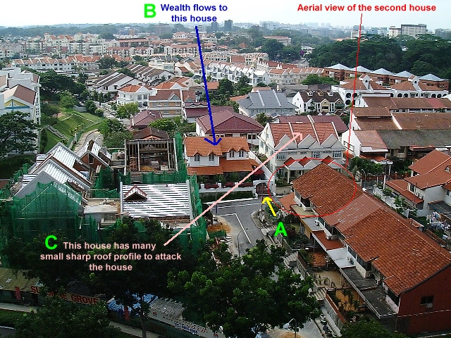 One will see a yellow arrow. Notice carefully that the main gate of another house is directly facing this `second house (with bad Feng Shui)'.